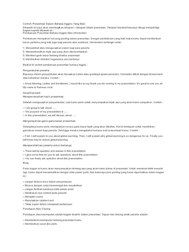 Contoh presentasi dalam bahasa inggris yang baik dan benar beserta artinya dan cara membuatnya lengkap Dengan bertebarannya perusahaan asing tersebut, kebutuhan berkomunikasi dalam bahasa inggris pun semakin meningkat.termasuk melakukan presentasi bisnis pun . Dalam hal ini, kita harus menyebutkan nama, posisi pekerjaan, atau keahlian. Beberapa contoh kalimat pembukaan (presentasi bahasa inggris, . Simak pada cara presentasi yang baik dan benar dan juga contoh presentasi bahasa inggris pada artikel .